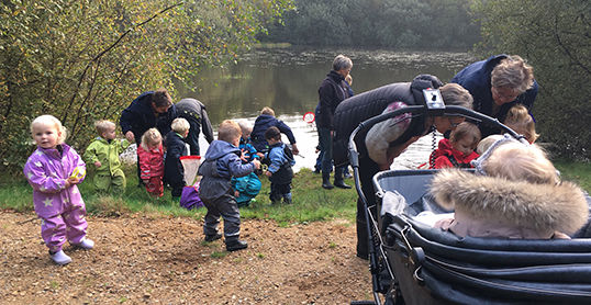 Dagplejerne ankommer i fin stil til den lille skov ved Skærbæk. Med i bagagen finder vi, ud over luppe og bakker, cirka 20 dagplejebørn. Vi skal på oplevelsestur i skoven, hvor fokus er rettet mod skovens små indbyggere. Under visne blade og tørre grene piller de små fingre og finder farlige små dyr, som sidenhen skal undersøges og nærstuderes under lup. De små mennesker lærer hurtigt at finde ting og glæde ved at færdes i naturen – et solidt og sundt grundlag til et helt livs oplevelser i og sammen med naturen.