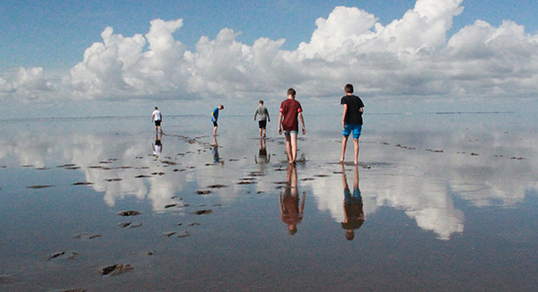 Vi befinder os nær den nordligste spids af Rømø – et uberørt og ensomt sted, hvor viber og kobbersnepper laver luftakrobatik og jager et par krager væk. Ude på vaden bliver der fanget krabber og gravet sandorme, muslinger og sneglehuse bliver studeret – der er et mylder af liv. Sammen oplever vi tidevandets bevægelser, som jagter vores ben på vej ind til stranden og forlandet. Snart er de store tørlagte vader igen vanddækkede. Månen trækker i vandet – svært at forstå. Vi går langsomt ind mod kysten, mens rylerne flyver om ørerne på os.