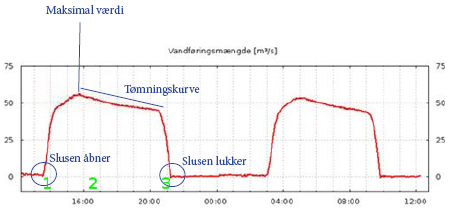 Herefter følger vandføringsmængden en "tømningskurve", indtil slusen lukker igen (3).