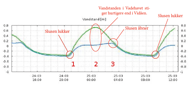 Vandstanden i Vadehavet stiger hurtigt igen, mens vandstanden i Vidåen stiger meget langsomt (2) på grund af opstuvning af nedstrømmet vand i Vidåsystemet.